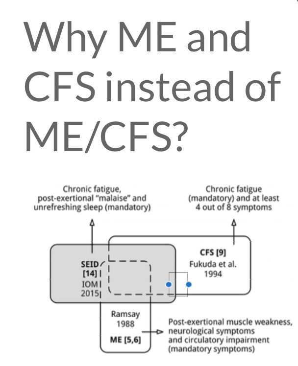The diagnostic criteria for CFS are quite wide. You basically need to have had more than 6 months of prolonged and unexplained fatigue along with some additional symptoms that may include (but do not have to include): pain, post exertional malaise (PEM), orthostatic intolerance and/or sleep disturbances. I fit all of the criteria for CFS (including all of the “optional” criteria), but I also fit all of the diagnostic criteria for ME, which are far more specific and actually compulsory for a diagnosis. In order to be diagnosed with ME, you must have: 1) Post-Exertional Neuroimmune Exhaustion 2) Neurological Impairments 3) Immune, Gastro-intestinal & Genitourinary Impairments and 4) Energy Metabolism/Ion Transportation Impairments. You can see that these two conditions are not necessarily the same thing. You could meet the criteria for CFS but not meet the criteria for ME. As stated in the primer, this has lead to confusion as to what should be researched in terms of treatments and if treatments that help those with CFS will help those with ME.